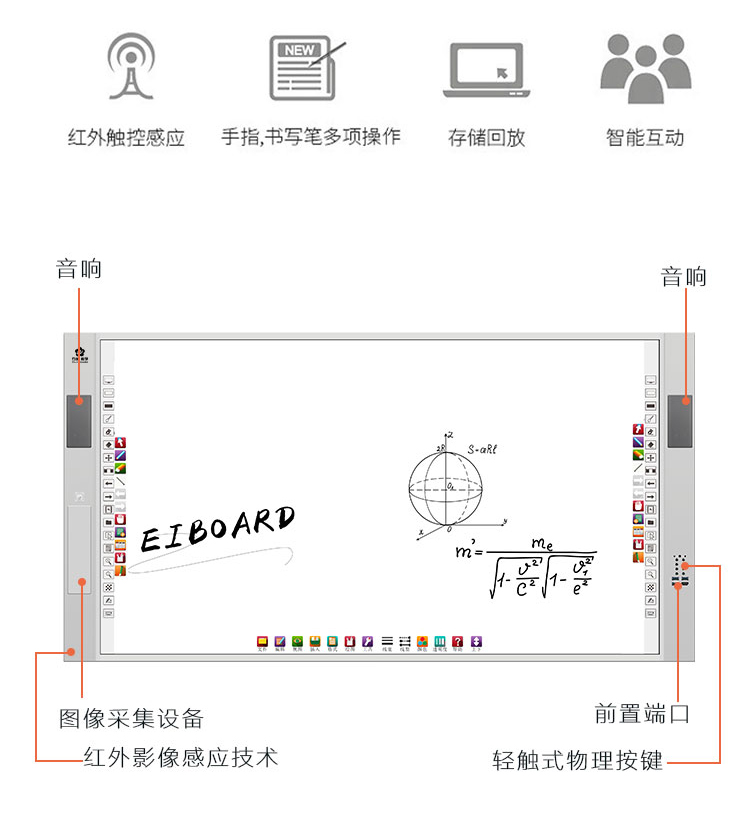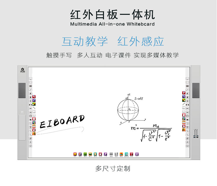 紅外白板91视频免费版下载集電腦、音箱、展台、智能中控、白板於一體,采用一體化無縫拚接設計美觀大氣,電控展台方便收納,紅外二十點觸控滿足多人同時書寫,板麵采用冷軋麵板防撞防刮,尺寸擴展性強,滿足不同教學場景需求。